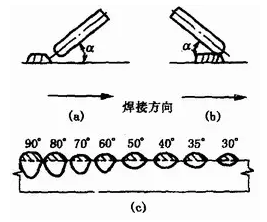 (2)電極(焊絲)傾角焊接時,電極(焊絲)相對于焊接方向可以傾斜一個角度。當電極(焊絲)的傾角順著焊接方向時叫后傾;逆著焊接方向時叫前傾,見圖1—32(a)、(b)。電極(焊絲)前傾時,電弧力對熔池液體金屬后排作用減弱,熔池底部液體金屬增厚了,阻礙了電弧對熔池底部母材的加熱,故焊縫厚度減小。同時,電弧對熔池前部未熔化母材預熱作用加強,因此焊縫寬度增加,余高減小,前傾角度。愈小,這一影響愈明顯,見圖1—32(c)。
