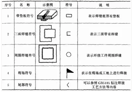 輔助符號是表示焊縫表面形狀特征的符號,見表1—5。應(yīng)用示例見表1—6。