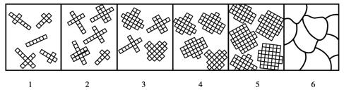 金屬結(jié)晶時(shí),首先從液態(tài)金屬中形成一些極細(xì)小的晶體,這些極細(xì)小的晶體稱為晶核,它不斷吸附周圍液體中的原子而長(zhǎng)大。與此同時(shí),在液體中又不斷產(chǎn)生新的晶核并相繼長(zhǎng)大,直到全部液體凝固為止,最后金屬便由許多外形不規(guī)則的小晶體(晶粒)所組成,如圖1.2.7所示。因此,液體金屬的結(jié)晶過程包括晶核的形成和晶核的長(zhǎng)大兩個(gè)基本過程,而且這兩個(gè)過程是同時(shí)進(jìn)行的。