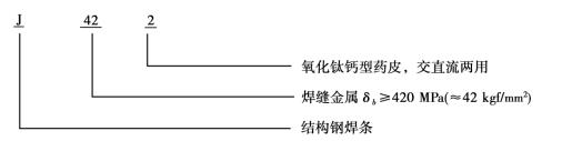 焊條牌號是焊條行業統一的焊條代號。焊條牌號一般用一個大寫拼音字母和三個數字表示。拼音字母表示焊條的大類,如“J”表示結構鋼焊條,“Z”表示鑄鐵焊條等;前兩位數字表示各大類中若干小類,如結構鋼焊條前兩位數字表示焊縫金屬抗拉強度等級,單位為kgf/mm2;最后一個數字表示藥皮類型和電流種類,其中1~5為酸性焊條,6和7為堿性焊條。1~6為交、直流兩用,7只用于直流電焊接。例如: