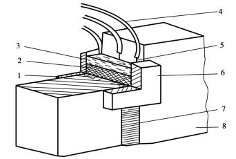 1—已凝固的焊縫金屬 2—金屬熔池 3—熔渣池4—導(dǎo)電嘴 5—焊絲 6—水冷滑塊 7—焊縫 8—母材