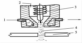 等離子弧切割原理(圖) 2019-07-0510:36:19等離子弧切割原理(圖)已關閉評論等離子弧切割是先于等離子弧焊的一種新工藝,如圖4.3.4所示。它的切割原理和氧氣切割不同,它是利用能量密度高的高溫高速的等離子流,將切割金屬局部熔化并隨即吹除,形成整齊的切口。因此,它能切割一般氧氣切割所不能切割的金屬,如不銹鋼、鋁、銅、鈦、鑄鐵及鎢、鋯等難熔金屬,也可用于切割花崗石、碳化硅、耐火磚、混凝土等非金屬材料。圖4.3.4 等離子切割原理示意圖1—冷卻水 2—等離子氣 3—電極4—等離子弧 5—工件 贊 0 分享