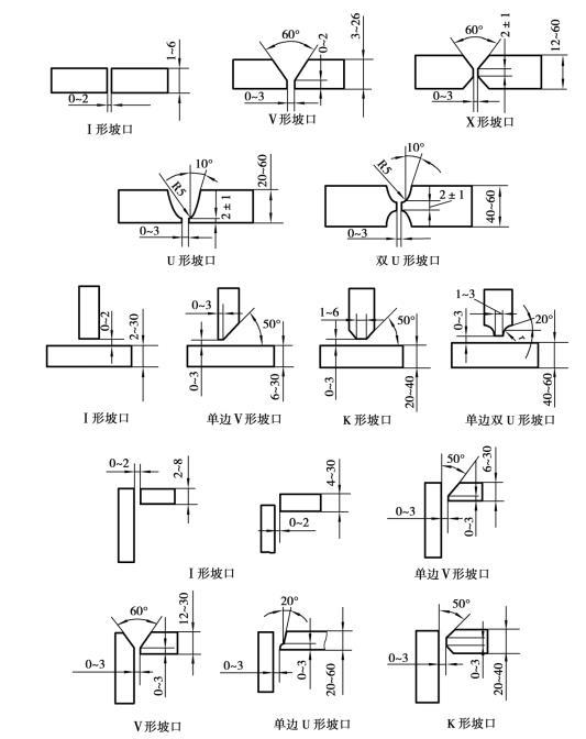 手工電弧焊板厚在6 mm以下對(duì)接時(shí),一般可不開坡口直接焊成。板厚較大時(shí),為了保證焊透,接頭處應(yīng)根據(jù)工件厚度預(yù)制各種坡口,坡口角度和裝配尺寸可按標(biāo)準(zhǔn)選用。厚度相同的工件常有幾種坡口形式可供選擇,V形、U形坡口只需一面焊,可焊到性較好,但焊厚角變形較大,焊條的消耗量也大些。X形和雙面U形坡口兩面施焊,受熱均勻,變形較小,焊條消耗量較少,但必須兩面都可焊到,所以有時(shí)受到結(jié)構(gòu)形狀限制。U形和雙面U形坡口根部較寬,允許焊條深入與運(yùn)條,容易焊透,而且焊條消耗量也較?。坏蚱驴谛螤顝?fù)雜,需用機(jī)械加工準(zhǔn)備坡口,成本較高,一般只在重要的受動(dòng)載的厚板結(jié)構(gòu)中采用。