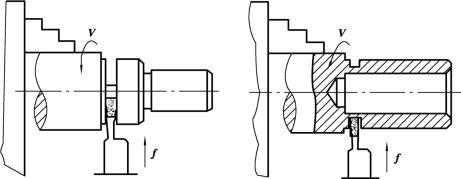 ①對于短軸和小套,可在一次裝夾中車出各加工面,然后切斷,如圖5.2.3所示。由于各加工表面具有同一回轉軸線,能保證各外圓與內圓的同軸度要求,端面對軸線的垂直度或端面圓跳動要求。
